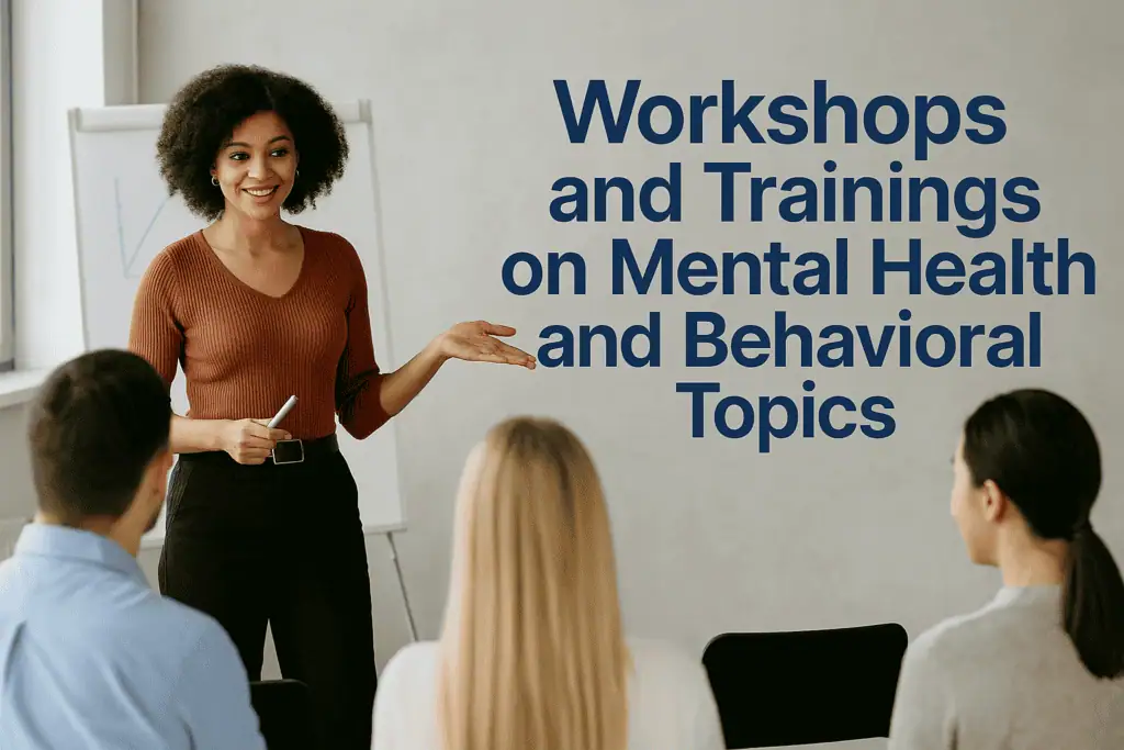 Workshops and training sessions for organizations, schools, and community groups on various topics related to mental health, behavior analysis, and neuropsychology. Topics include stress management, behavioral health in schools, emotional regulation, and more.
